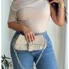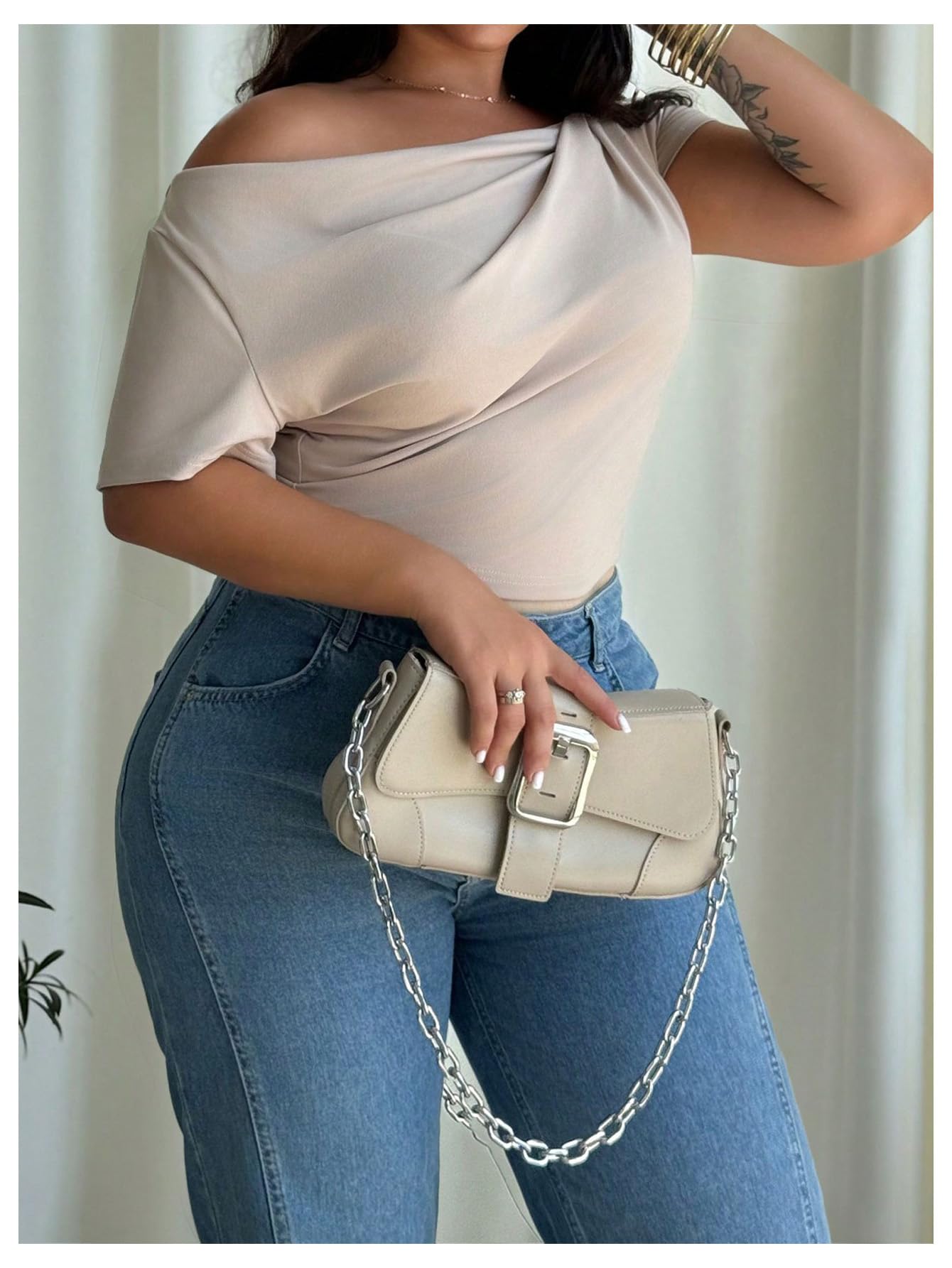 For a sophisticated everyday look: Pair this with blue jeans (as shown) and gold layered jewelry. The contrast between the exposed shoulder and the satin sheen creates a sophisticated vibe, making you an instant star at markets and coffee shops.