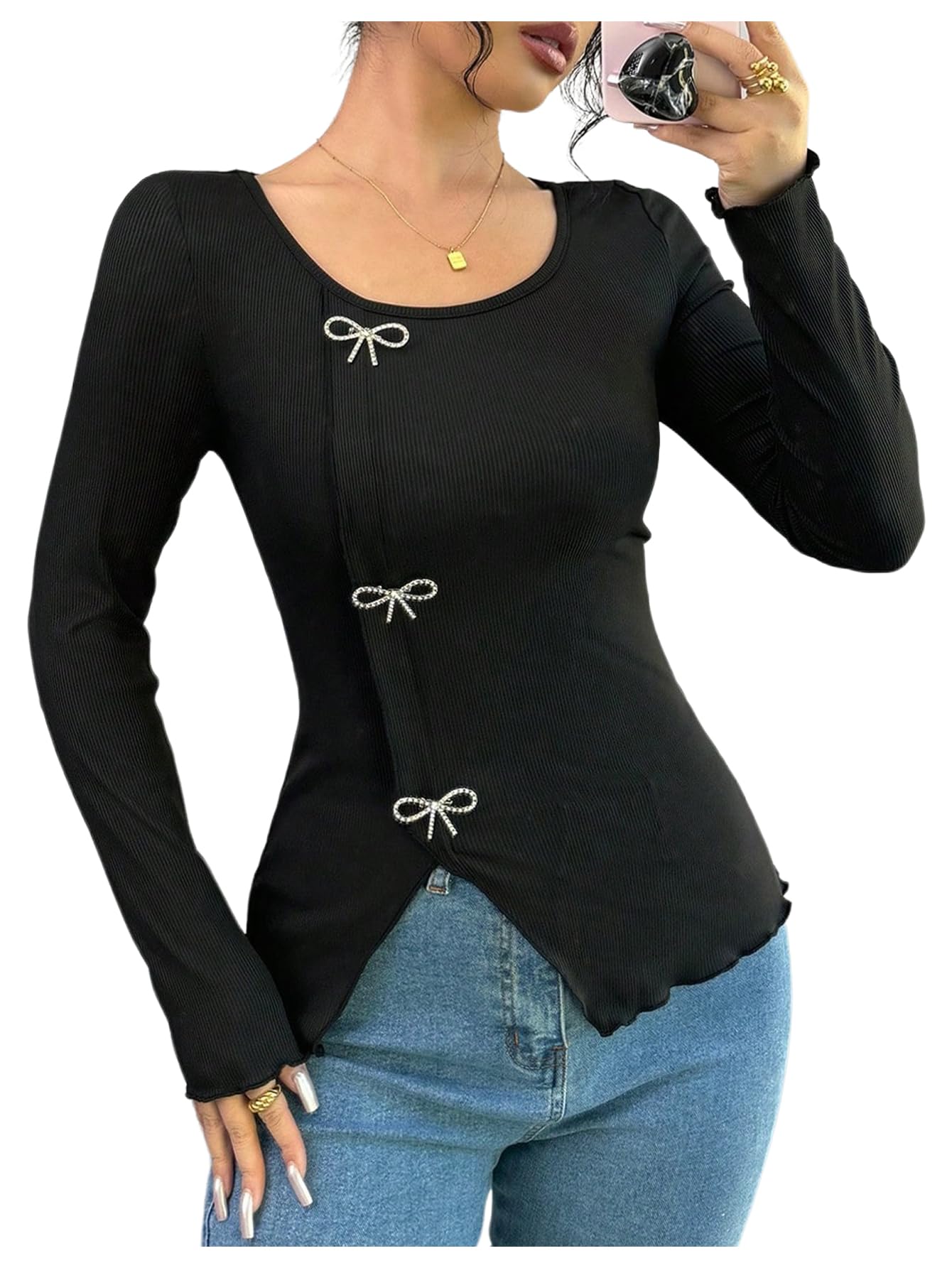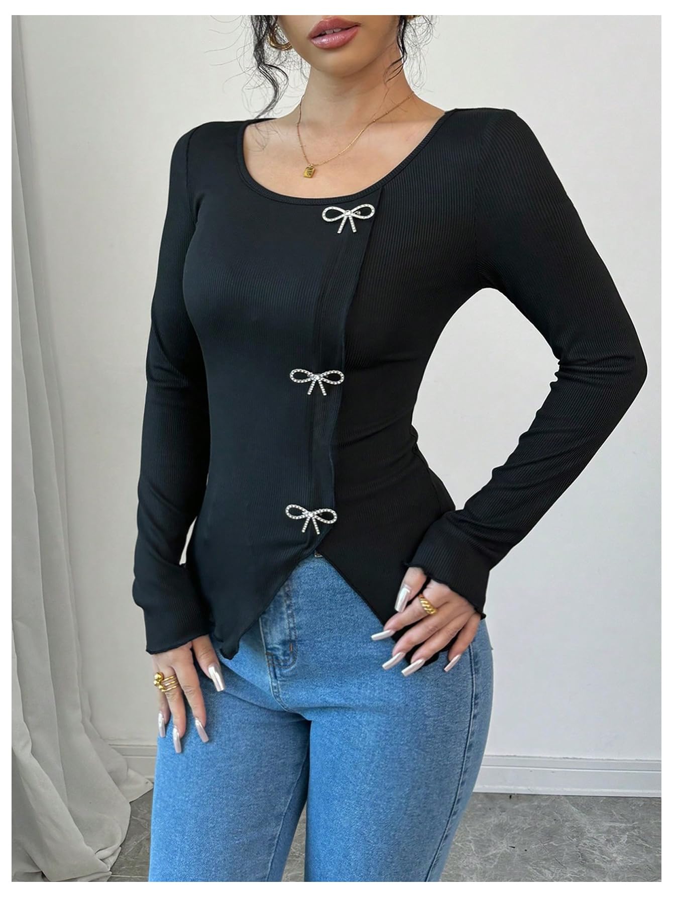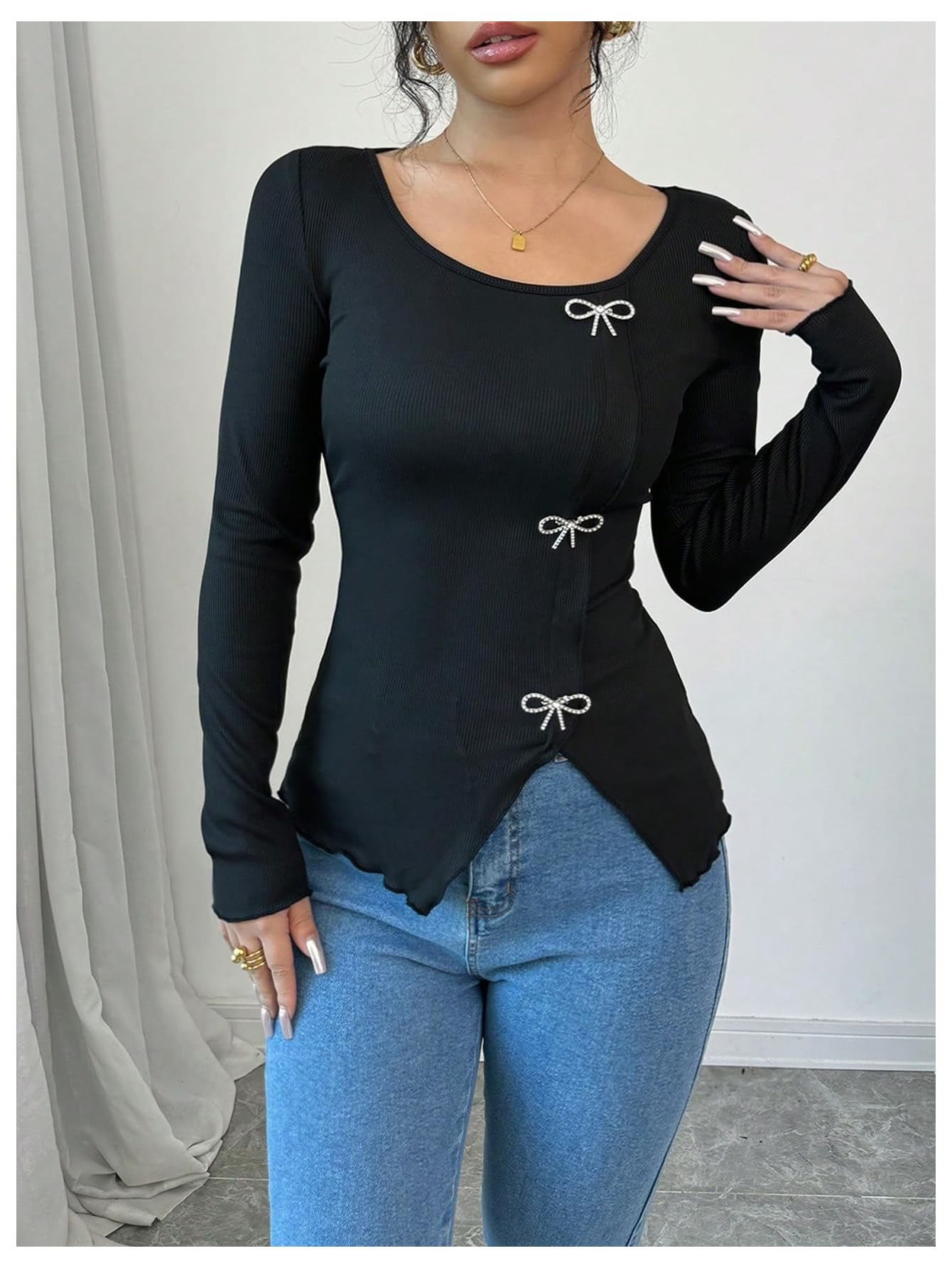 Whether you’re seeking a sweet and chic chic look or prefer a cool and sophisticated style, this bow-tie slim-fit top is a wardrobe enthusiast – its pure black base, metallic details, and slim fit make it a versatile and eye-catching option for any occasion.