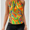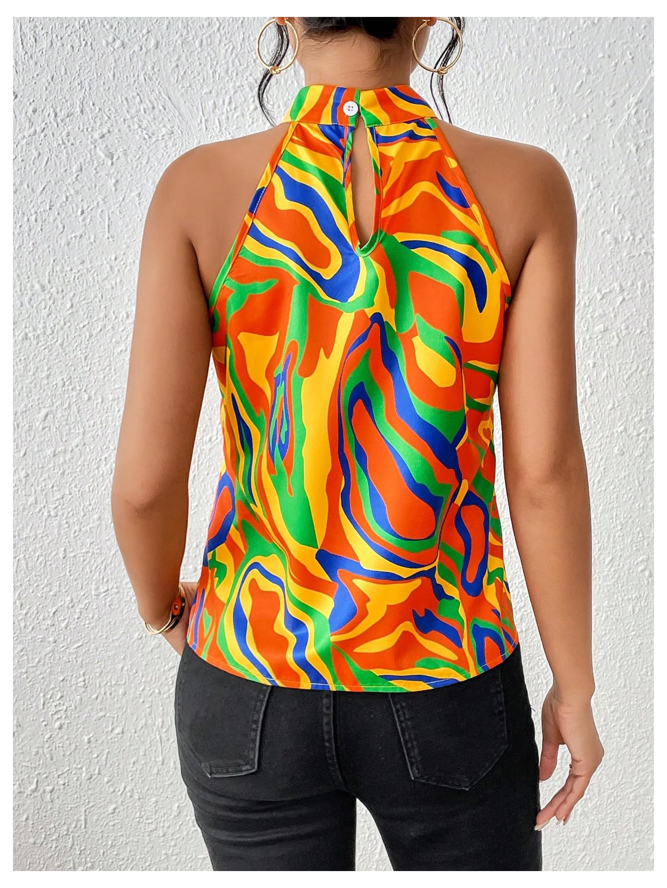Whether you’re a retro lover or looking to add an arty touch to your wardrobe, this halterneck printed top is sure to be a wardrobe standout. Its contrasting colors, satin sheen, and retro silhouette make it a versatile and modern piece.