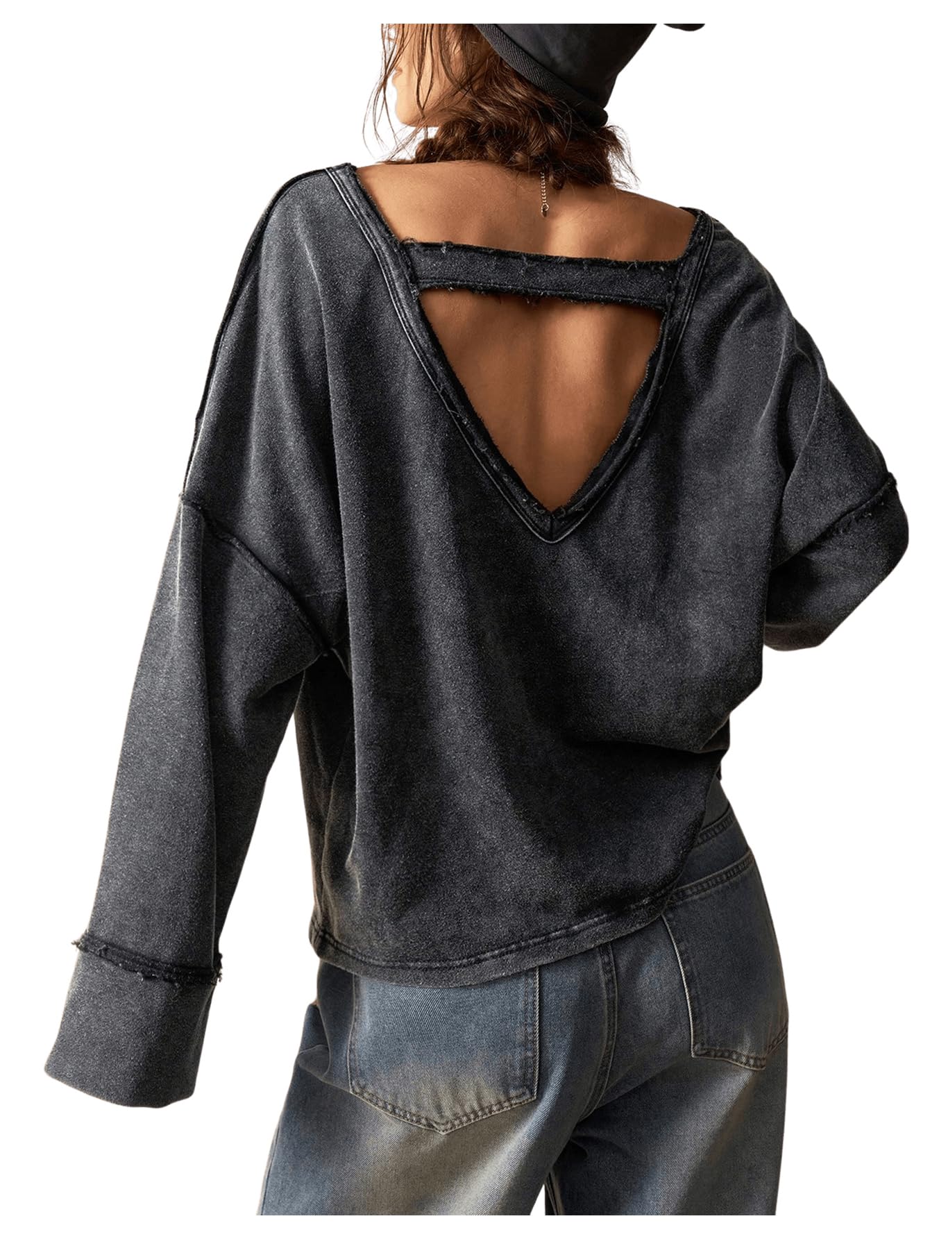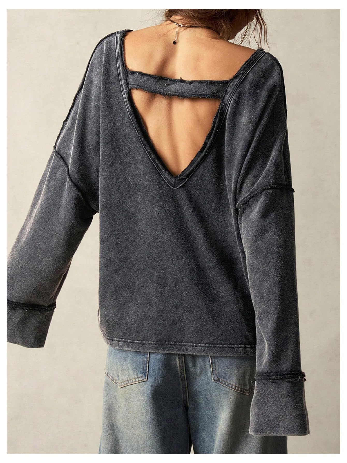 V-Back with Strap Design: The front features simple, loose, long sleeves for a discreet, understated look. The bold V-shaped back reveals graceful shoulder lines, accented by a casual strap, softening the sharpness of the back while adding a relaxed, relaxed feel. The turn instantly captures the spotlight, creating a subtle, sexy yet uninhibited vintage vibe.