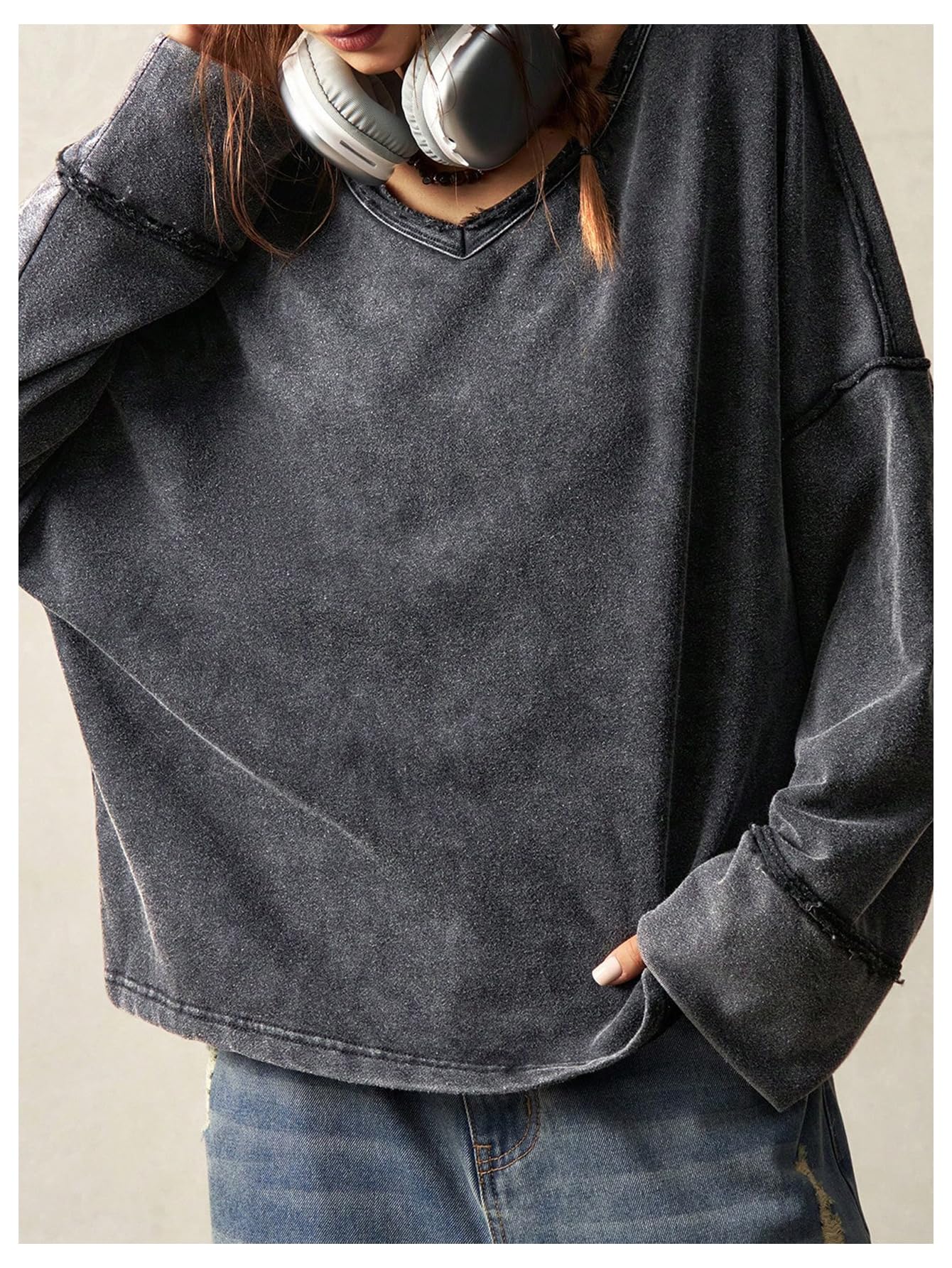 Washing Details: The distressed finish is natural and even, while the frayed edges on the neckline and cuffs complement the overall texture, creating a natural, timeless feel. The details exude a vintage feel.